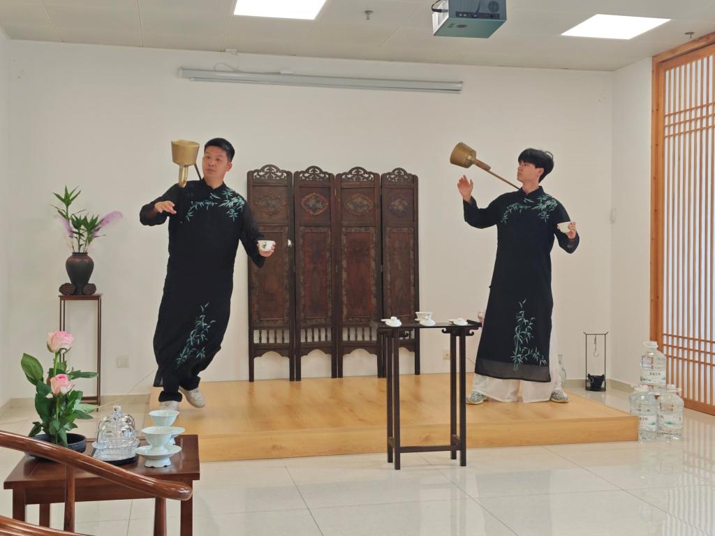田刚成一行人首先参观了四川巾帼非遗传习中心的非遗技艺展示区、教学实训区与成果展览区。随后,四川巾帼非遗传习中心非遗传承人李耀杨和王盼攀手持长约 1.2 米的长嘴铜壶,身着传统巴蜀茶艺服饰,以娴熟的技艺展示了"龙行十八式"长嘴铜壶茶艺表演,给调研团队留下了深刻的印象。