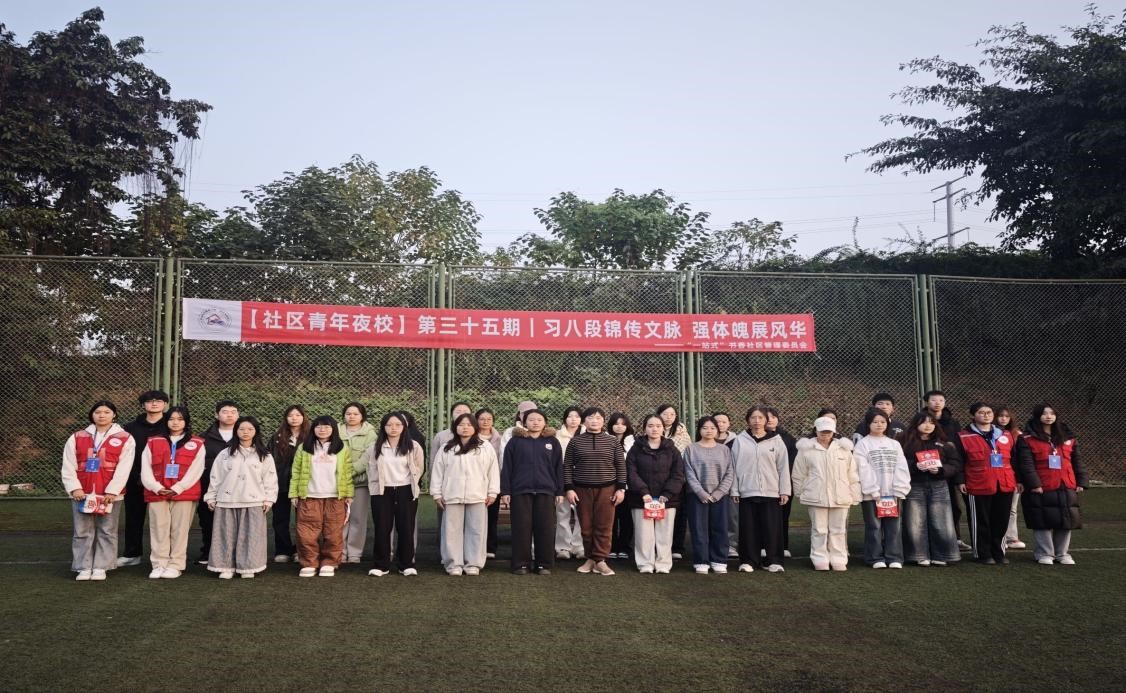 为了丰富校园文体生活、传承中华传统养生文化,11月25日,“一站式”书香社区组织30名学生代表在小足球场开展八段锦练习活动,此次活动邀请到原四川财经职业学院通识与人文教育学院李素英老师现场指导。