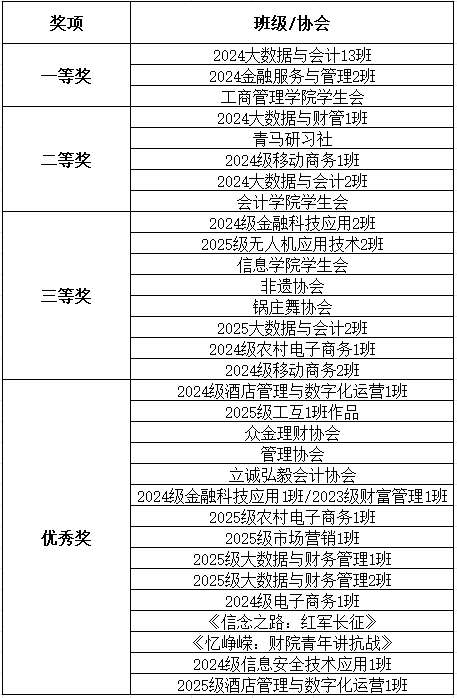 根据《关于举办财院青年说——讲述抗战故事活动的通知》的要求,经过各班级申报、二级学院初审、学生工作部复审,本次共评选出“一等奖”3个,“二等奖”5个,“三等奖”8个,“优秀奖”15个。现将结果进行公示。公示时间:2025年10月11日-2025年10月13日。如对评选结果有异议,请在公示期间实名反馈。办公室:学生公寓二楼204。