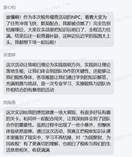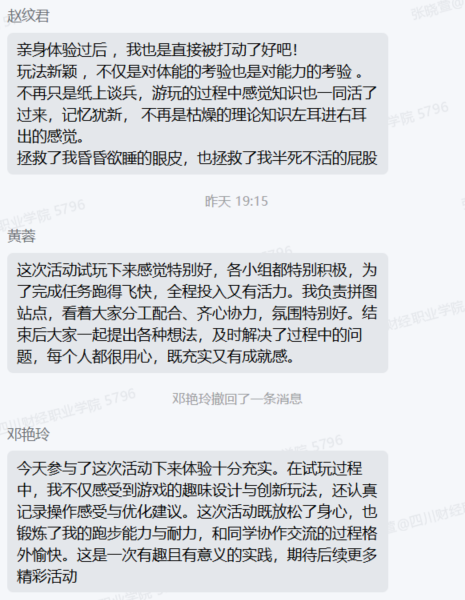 活动结束后,财税学院组织同学们围坐复盘,收集优化建议30余条。财税学院副院长罗艾在总结讲话中表示:“这次活动让同学们真正‘动’了起来——身体在奔跑,思维在运转,知识在运用。我们希望打破传统课堂的边界,让学习不再局限于教室和书本,而是在真实的场景中、在团队协作中、在解决问题的过程中自然发生。让学生动起来,让学习活起来,让知识用起来,这正是我们推进数智化课程思政改革的初衷。”