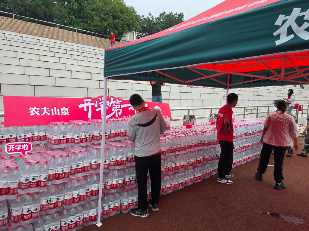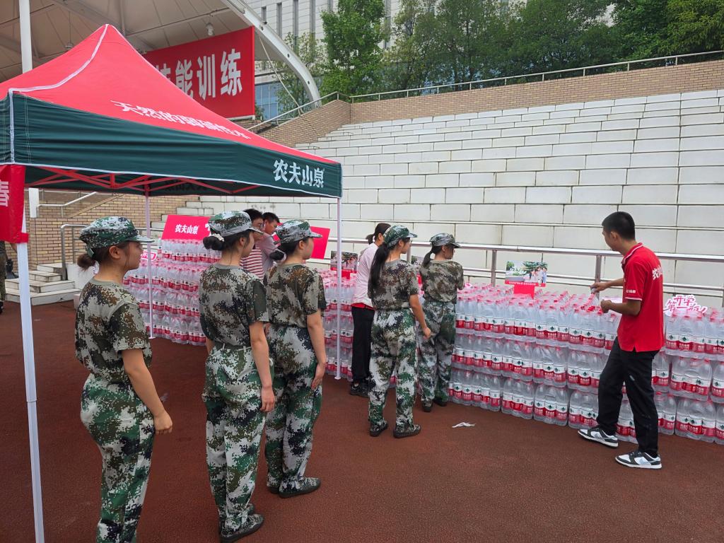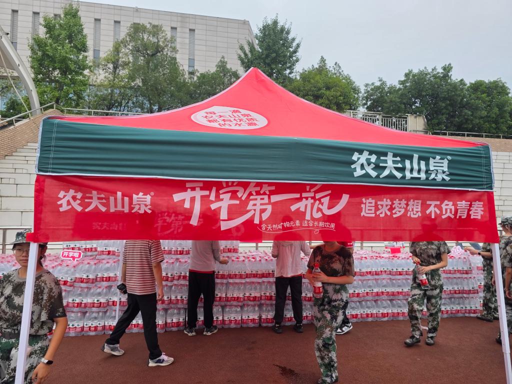 刚入校园的新生们身着迷彩服,正经历着军训的烈日与疲惫。而运动场旁的补给站里,成垛的农夫山泉整齐码放,红绿色相间的帐篷下,“开学第一瓶,追求梦想不负青春”的标语格外醒目。工作人员刚将水整理完毕,便有新生带着训练后的薄汗走来,接过水瓶时的笑容,成了初秋校园里最生动的画面。