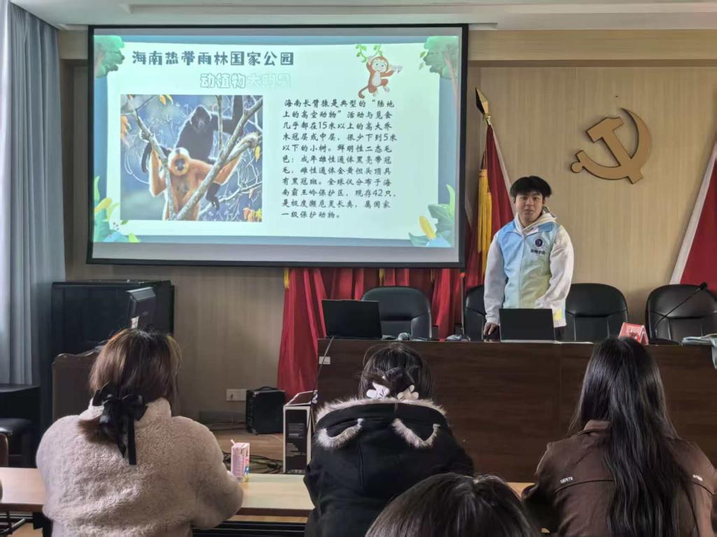 随后,宣讲员以海南热带雨林国家公园为例,介绍了仅存于霸王岭的珍稀物种——海南长臂猿。通过图片展示,孩子们了解到这种“树冠居民”终身栖息于15米以上高林层。雄猿通体乌黑,雌猿身披金毛,全球仅存42只,属于国家一级保护动物。讲解生动具象,增强了孩子们对生态保护的理解与责任感。