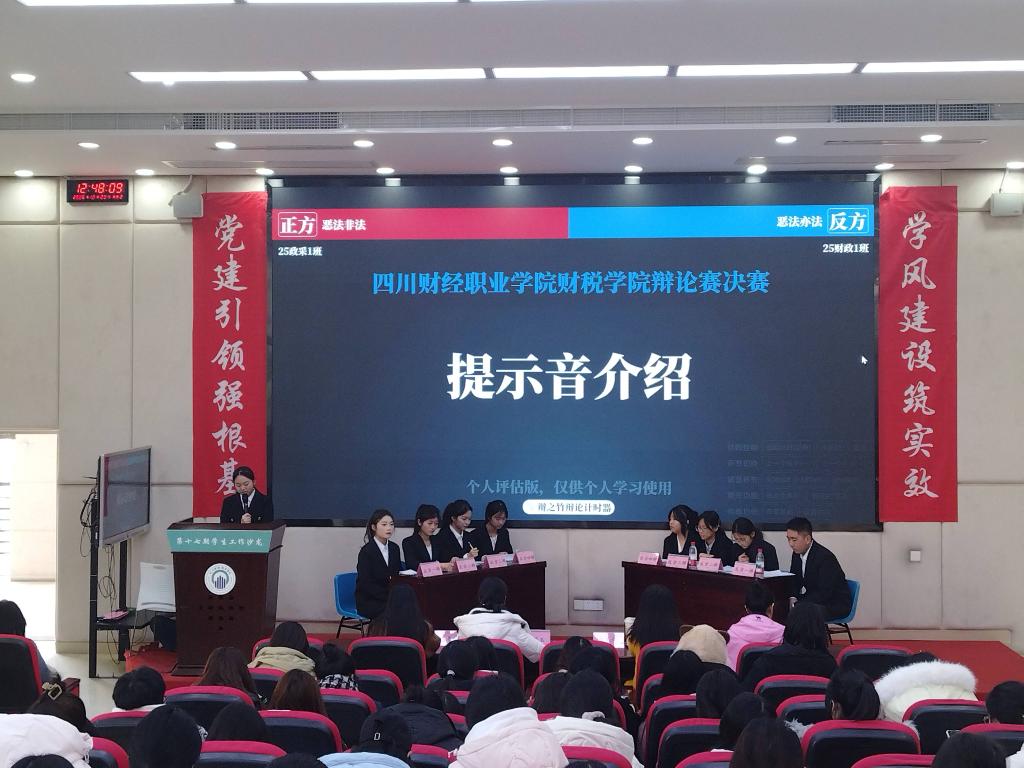 2025年12月23日中午12:30,四川财经职业学院财税学院辩论赛决赛在B213教室顺利举办。正方25政采1班与反方25财政1班围绕“恶法是否为法”这一辩题展开激烈对决,戴娜娜、张毛宁、刘子境、来倩、兰茹玉五位老师受邀担任评委。