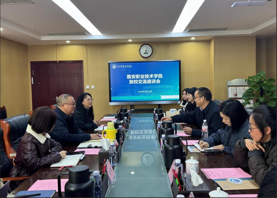 2025年12月10日下午,雅安职业技术学院党委常委、副校长樊先茂率计划财务处、教务处相关负责人一行到我校开展调研交流。我校党委委员、副院长罗潇,财务处处长邱永芳、副处长黄媛,财务处、教务处相关人员参加交流。会议在明德楼912会议室举行,由邱永芳主持。