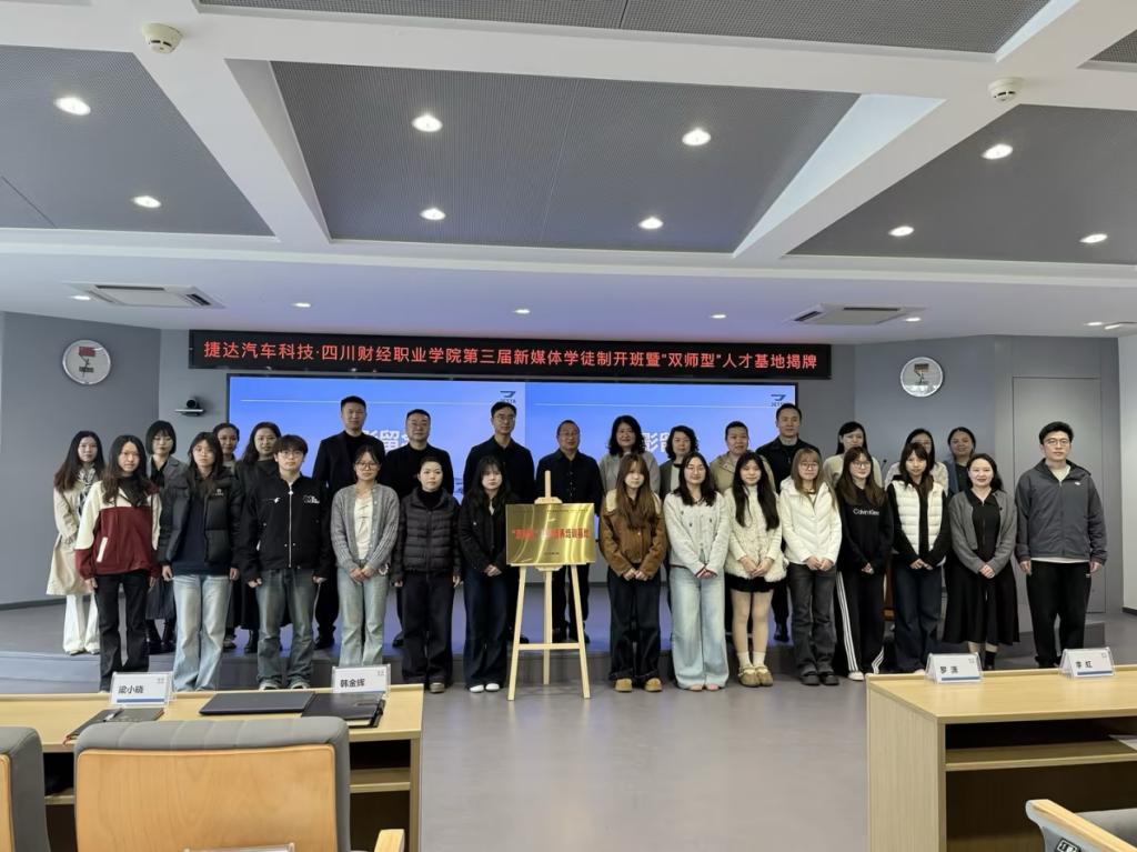 春潮涌动启新程,校企携手育英才。2026年3月9日上午,捷达汽车科技与四川财经职业学院新媒体项目班开班仪式暨校企“双师型”教师培养培训基地揭牌仪式,在捷达汽车科技322号楼阶梯会议室隆重举行。四川财经职业学院副院长罗潇、工商管理学院党总支书记梁小晓等院校领导,陕西财经职业技术学院相关专业教师代表,捷达汽车科技人力资源总监韩金辉、新媒体项目运营经理姚旺等企业负责人,以及新媒体项目班全体学生出席仪式,共同见证校企深度合作的重要时刻,开启产教融合、协同育人的新篇章。