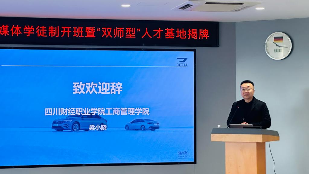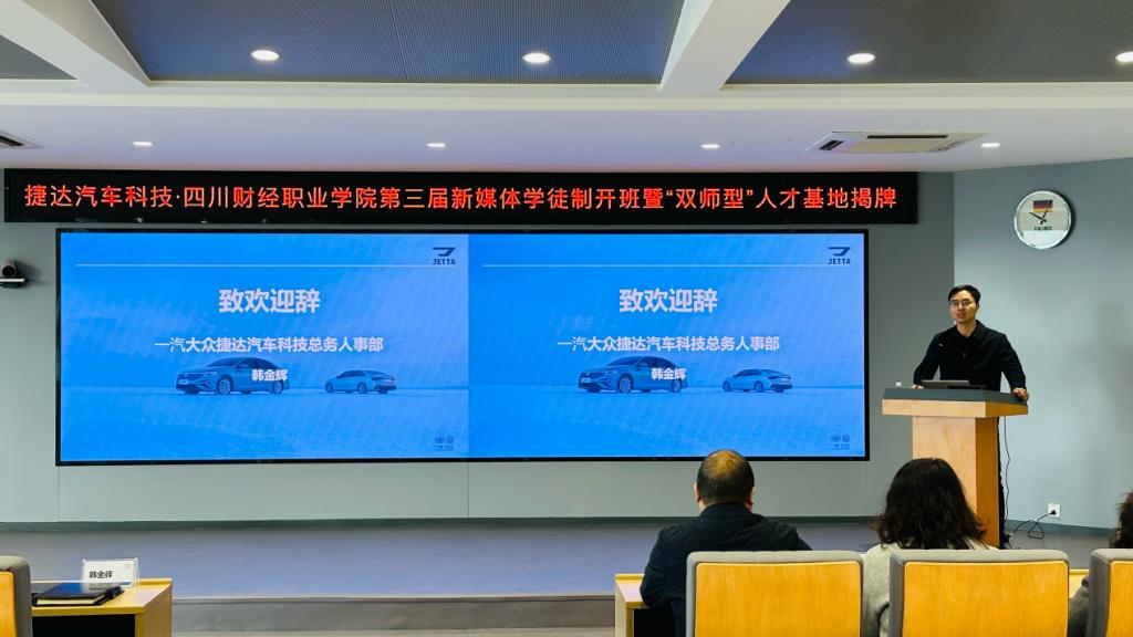 此次开班仪式的顺利举行,是双方深化产教融合、落实职业教育改革要求的具体举措,标志着捷达汽车科技与四川财经职业学院的合作进入常态化、精细化发展阶段。仪式现场,捷达汽车科技人力资源总监韩金辉首先致欢迎辞,他对各位院校领导、教师及全体学员的到来表示热烈欢迎,详细介绍了捷达汽车科技的发展历程、新媒体业务布局及人才需求方向。他表示,随着汽车行业数字化转型加速,新媒体已成为品牌传播、产品推广的核心阵地,企业亟须一批兼具专业素养与实战能力的复合型新媒体人才。此次与四川财经职业学院共建新媒体项目班,正是企业链接教育资源、破解人才痛点的重要尝试,未来企业将全力提供实战平台、师资支持,助力学员成长为符合行业需求的实用型人才。