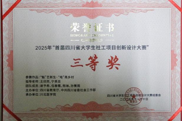 2025年11月9-10日,在项目负责老师王欣然的带领下,由工商管理学院谢予希、孙菁雨、熊琳、伍春霞四位同学组成的“魁”艺新生·“电”亮乡村团队,奔赴南充参加2025年“首届四川省大学生社工项目创新设计大赛”。经过激烈角逐,团队凭借其围绕彭州军屯锅魁设计的创新型社工项目,在比赛中表现优异,最终荣获大赛三等奖。
