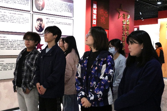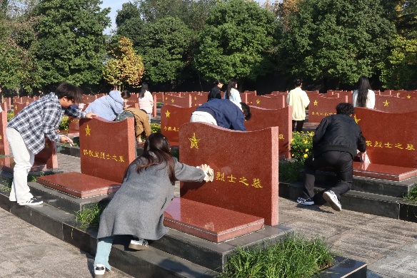 上午,党团队伍走进郫都区烈士陵园。在纪念馆内,烈士遗物、战斗手稿与事迹展板系统还原了革命先辈的峥嵘岁月,同学们驻足凝视、认真记录,接受深刻的精神洗礼。随后,大家手持抹布庄重擦拭烈士墓碑,以躬身实践寄托缅怀之情,全体成员肃立默哀,向革命先烈致以最崇高的敬意。