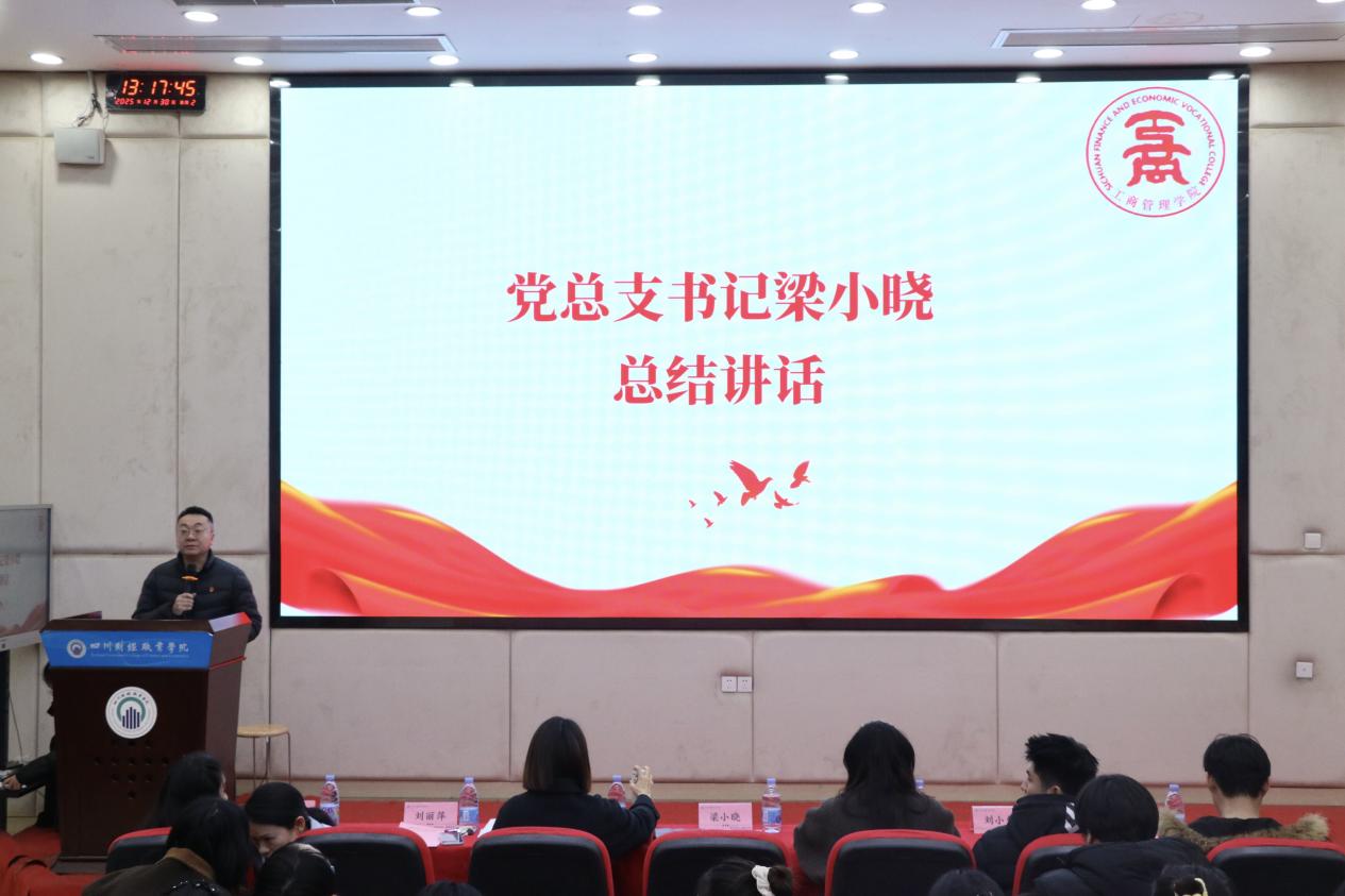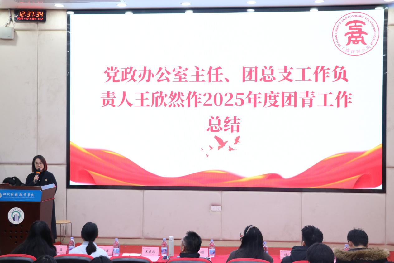 随后,王欣然老师作本年度团青工作总结。一是组织建设上的成果,本年度新发展团员109名,完成214名团员转入,组建18个新生团支部,实现团组织建设平稳衔接。严格落实“推优入党”制度,推荐44名优秀青年参加学校青马学习班,推选98名优秀团员成为入党积极分子,为党组织输送优质后备力量。二是创新实践与赛事获奖成果,工商管理学院与彭州市隆丰街道开展党建联建,与成都加倍加贝食品科技有限公司签订校企合作协议;成立“非遗创业孵化平台”;暑期“三下乡”两支队伍分获校级一、三等奖。首次参与四川省大学生社工项目创新设计大赛获省级三等奖,在中华经典诵写讲演系列活动中获省级二、三等奖;第二届志愿服务项目大赛中获校级二、三等奖。三是品牌建设与文化活动成果,紧扣“一院一品”建设,打造以川商精神为核心的商道文化品牌,全年开展10余项商道文化系列活动,吸引全校超2000人次参与,彰显学院特色文化内涵。王老师既细数了本学期取得的亮眼实绩,也客观剖析了工作中的短板与不足,为后续团学工作落地指明路径。