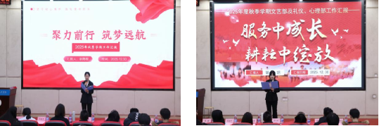 汇报环节中,团总支副书记余路程与学生会执行主席胡锦玥、张学友、田蕊依次登台作详细汇报。余路程主要汇报了自身负责的团务工作,以及指导组织部、秘联部的工作情况,介绍了组织部在主题团日、团员管理、资料归档等方面的实绩,和秘联部作为服务协调中枢保障活动开展的工作内容;胡锦玥分享了分管文艺部、礼仪、心理部的工作,文艺部斩获迎新晚会表演表彰、129合唱大赛一等奖等荣誉,礼仪、心理部完成学院活动承办,礼仪保障等工作,还在赛事协作中展现了学院风采;张学友以“启航学习实践,服务同学成长”为主题展开汇报,围绕自身分管板块聚焦学习实践与服务同学的核心目标,梳理了相关工作从策划落地到成效转化的全流程,也剖析了工作推进中存在的问题并明确了后续改进方向;田蕊围绕分管的青年志愿者协会与新媒体中心工作展开,青协累计开展14项志愿服务活动,服务超1800人次、总服务时长超118小时,新媒体中心则完成42场活动影像记录、40余篇新闻报道及25篇公众号推文。四人分别梳理各自分管板块的工作内容与实绩,分享工作中的经验收获,明确后续改进方向与重点任务,充分展现出团学骨干认真负责的工作态度与务实进取的担当精神。