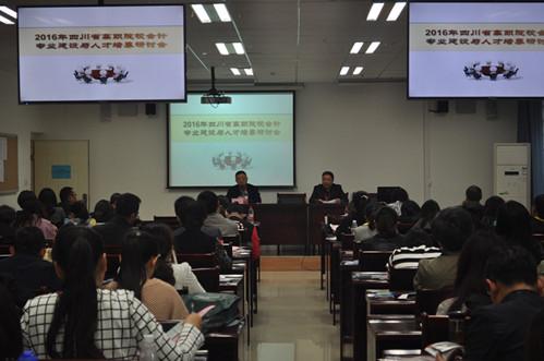 2016年4月16日,正值2016年“注协杯”四川省高职院校会计技能大赛如火如荼进行之际,在我院财经综合实训楼102培训教室,一场来自会计行业的思想盛宴——会计专业建设与人才研讨会顺利举行,与之交相辉映。来自台湾中华大学管理学院副院长裴文教授,原某知名企业财务审计处处长、新道教育研究院李媛媛副院长,西南财经大学会计学院副院长谭洪涛教授等著名学者、专家出席研讨会。我院会计一系杨勇主任、厦门网中网软件公司高级财会课程部赵静经理、新道科技股份有限公司李建国高级顾问、北京伴学科技有限公司孔令宇总经理及高等教育出版社上海事业部市场部胡伟峰主管分别在研讨会上发言。研讨会分上、下午两场,各参赛院校指导教师约100人参会,研讨会由我院副院长易思飞主持。