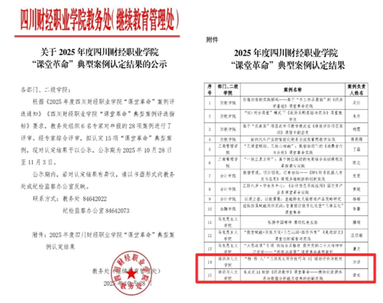 近日,四川财经职业学院教务处正式公示2025年度“课堂革命”典型案例认定结果。由黄欣名师工作室主持人黄欣教授牵头,工作室成员王继、胡岚、李倩与杨媛媛老师共同完成,并获李彬瑞老师协作支持的案例《生成式AI赋能〈经济数学〉课堂革命——模块化资源体系与数据分析能力培养...