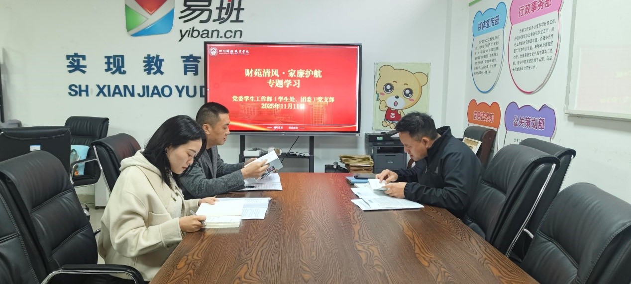 11月 11 日上午,学生工作部(学生处、团委)党支部于易班办公室召开 “财苑清风·家廉护航”家庭助廉学习会。会议由支部书记田刚成主持,学生工作部(学生处、团委)党支部党员干部参会。会上,全体干部集中学习了《四川财经职业学院党员干部操办婚丧喜庆事宜实施细则》。支部...