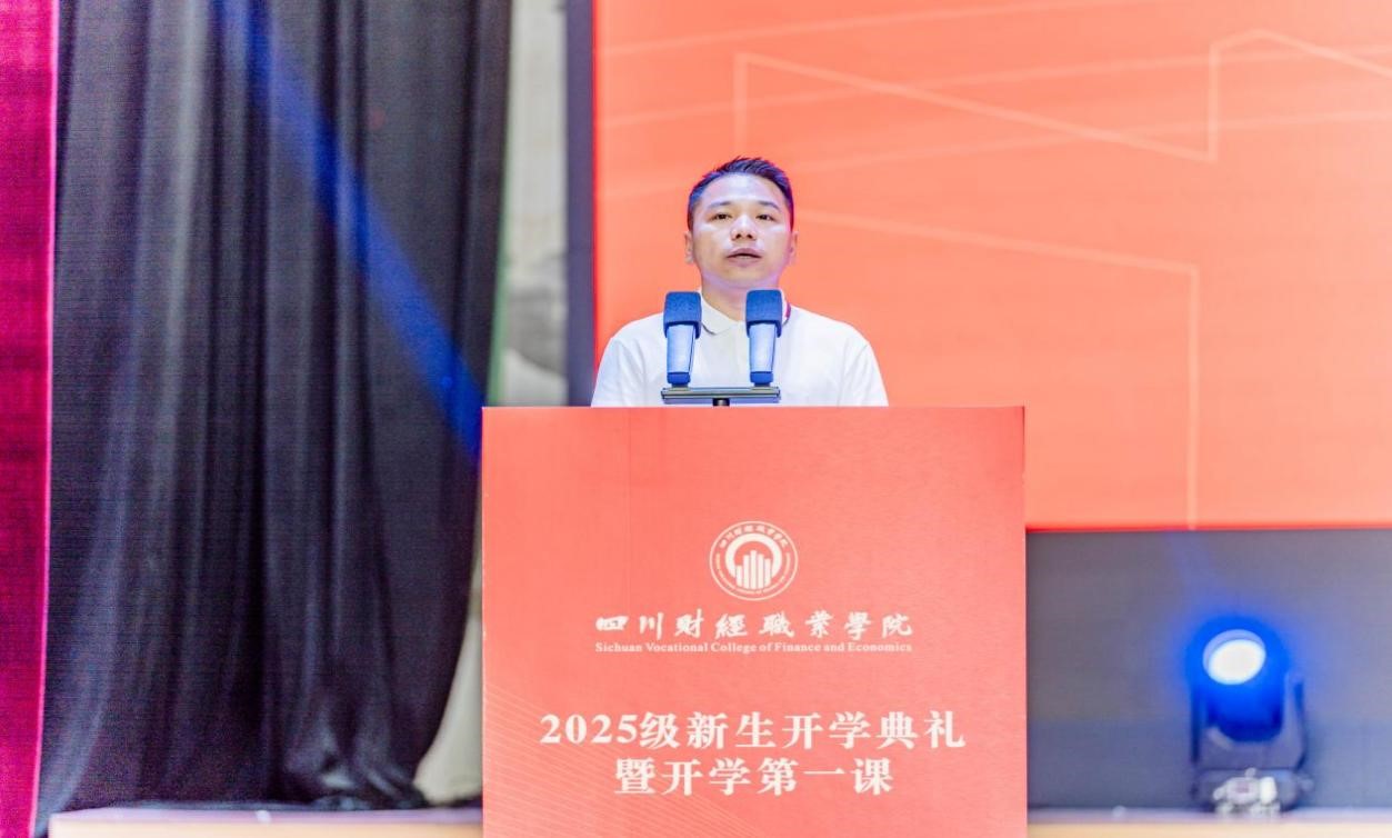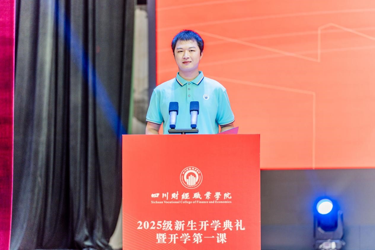 校友代表何源在发言中分享了自己在川财的求学时光,感谢母校的培育、恩师的教导。他表示,大学时光是人生中积淀力量、塑造自我的珍贵阶段,希望学弟学妹们在校园里懂得为学业投入精力、舍得为成长付出努力,珍惜当下的每一段学习时光,在逐梦路上奋勇向前,收获属于自己的成长与成就。