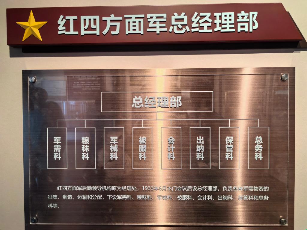 下午,团队来到红四方面军总指挥部旧址纪念馆。这座纪念馆始建于1982年,巧妙依托明清风格的通江文庙和学宫古建筑群而建,古朴的飞檐斗拱与朱红廊柱相映成趣,现已成为全国爱国主义教育示范基地、全国重点文物保护单位。步入馆内,历史的厚重感扑面而来。展陈以时间为脉络,通过泛黄的作战地图、珍贵的会议记录、磨损的通信设备等文物,系统呈现红四方面军从黄麻、商南、六霍起义建军,到艰苦卓绝的反“围剿”斗争,再到创建川陕苏区的辉煌历程。其中,红四方面军总经理部的机构设置图尤为醒目。该部于 1933 年 6 月木门会议后由经理处改组而成,下设军需、粮秣、军械、被服、会计、保管等多个科室,全面负责军需物资的征集、制造、运输和分配,其严密的分工与高效的运作,成为红色财经在后勤保障领域系统化运作的生动见证。此外,根据地群众和妇女独立团的故事,生动展现了不同群体为革命事业作出的独特贡献。