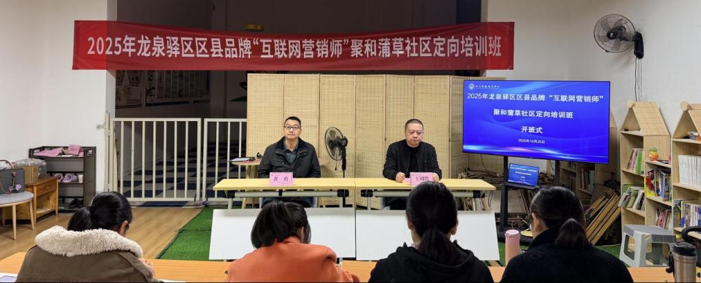近年来直播电商迎来快速发展,为积极响应人力资源社会保障部面向社会人员开展职业能力验证的工作,由四川财经职业学院主办的“2025年龙泉驿区区县品牌‘互联网营销师’聚和蒲草社区定向培训班”于2025年10月25日在龙泉驿区聚和社区党群服务中心顺利开班。四川财经职业学院继续教育学院副院长黄勇、聚和社区党委书记王周俊出席开班仪式。聚和社区、蒲草社区共50名人员参加此次培训。
