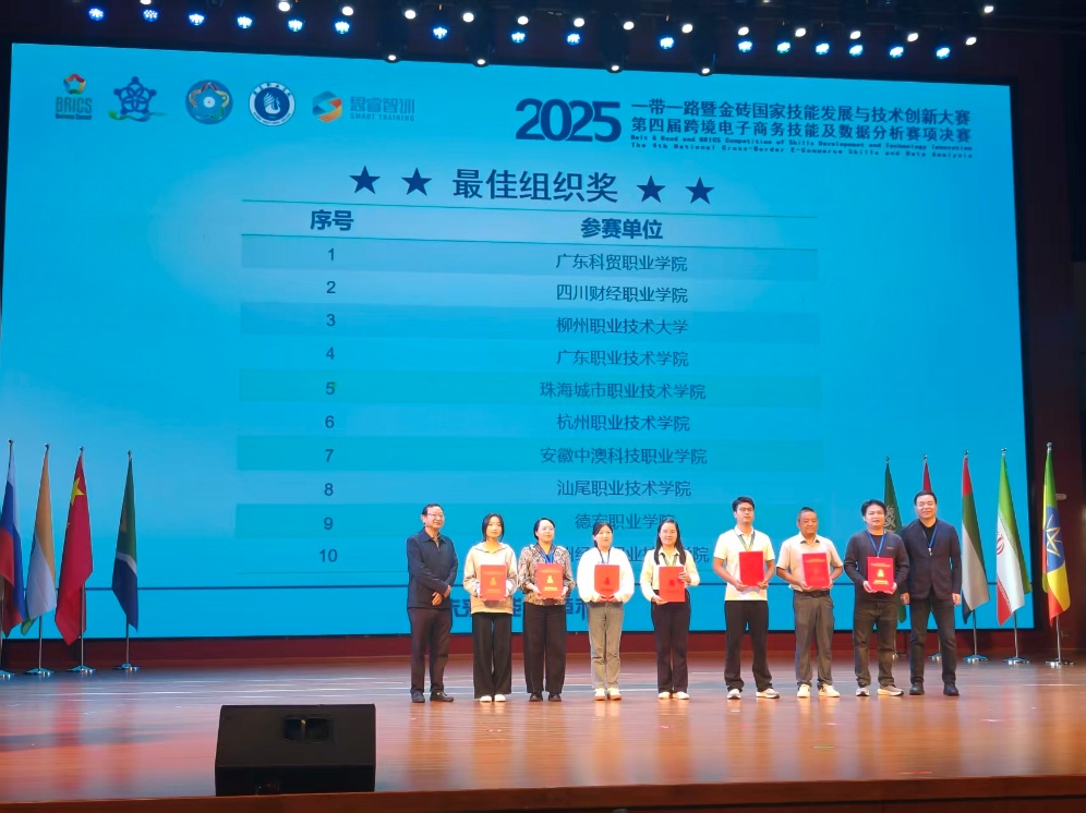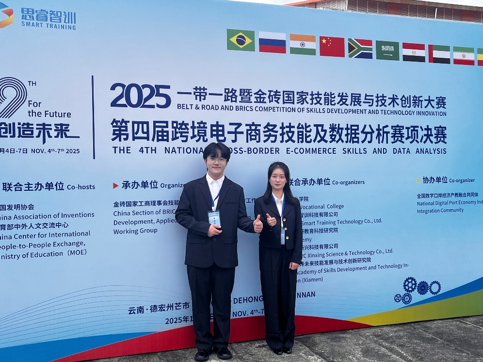 2025年11月4日-7日,由教育部中外人文交流中心、一带一路暨金砖国家技能发展国际联盟等单位举办的“2025一带一路暨金砖第四届跨境电子商务技能及数据分析全国总决赛”在云南省芒市举办,由信息学院陈怡桉、王曦老师指导,学生陈刚、陈茜参加的商务数据分析与应用专业参赛队经历了初赛、复赛、决赛,通过层层选拔,最终荣获全国金奖,成功晋级北非国际赛,四川财经职业学院获得最佳组织奖。