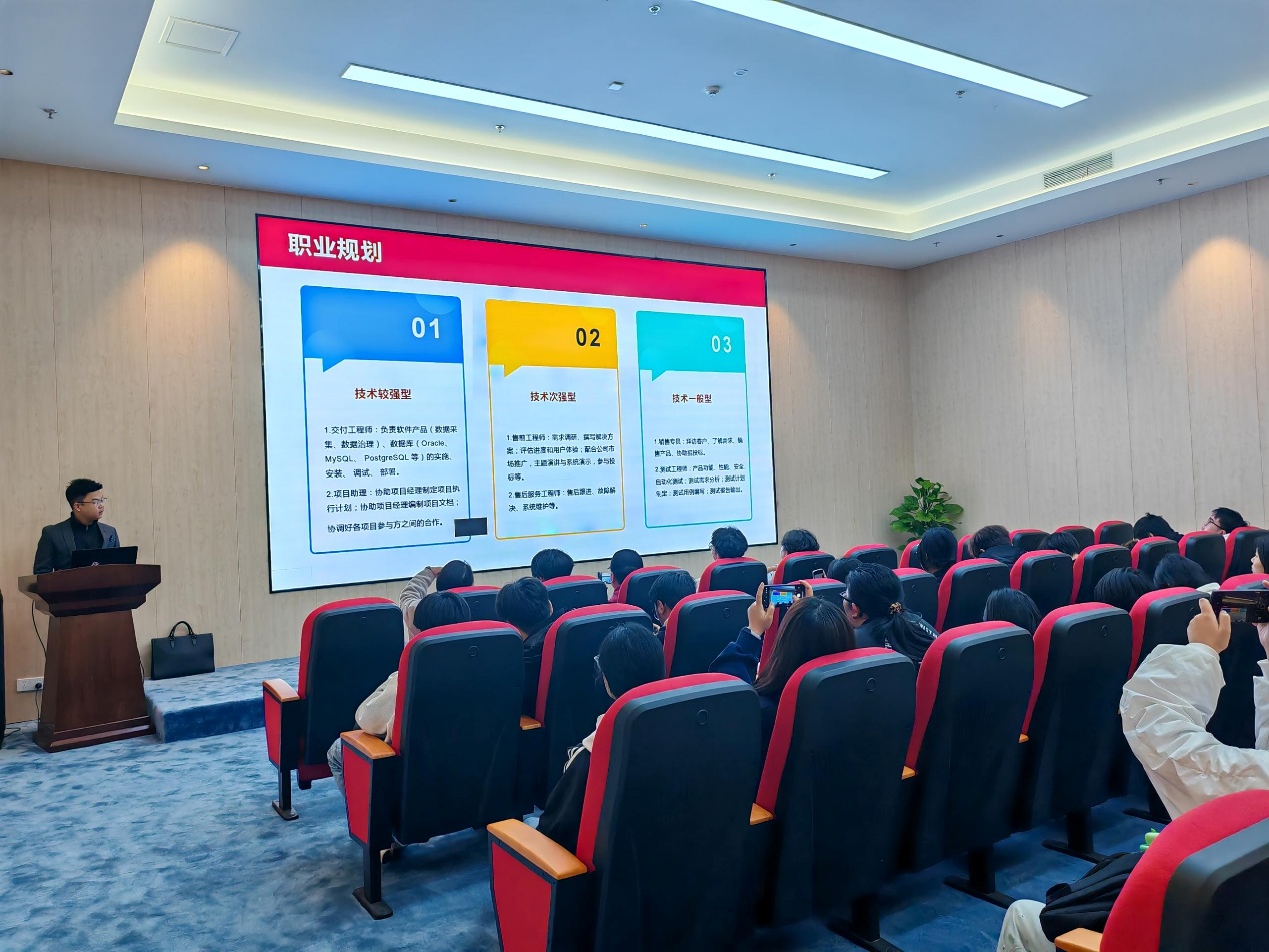 参观结束后,师生们齐聚会议室,参加由公司技术专家主讲的专题讲座。公司技术专家聚焦大数据存储计算、人工智能分析、工业互联网平台应用等前沿技术,结合实际项目案例深入讲解技术落地逻辑与岗位技能要求,内容详实、针对性强,让同学们对专业知识的实际应用有了更清晰的认知。在互动答疑环节,同学们踊跃提问,围绕职业规划、技能提升、岗位招聘等核心问题与企业专家展开深入交流,专家们结合行业经验与企业需求逐一解答,为同学们提供了极具价值的一线职场参考。