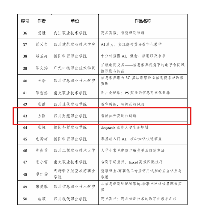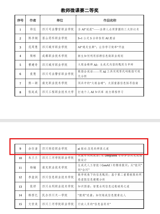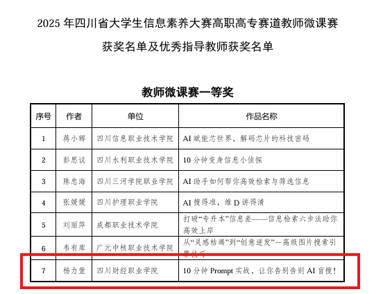 近日,四川省教育厅主办了“2025年四川省大学生信息素养大赛”系列活动。在“高职高专赛道教师微课赛”环节,我校教师表现出色。