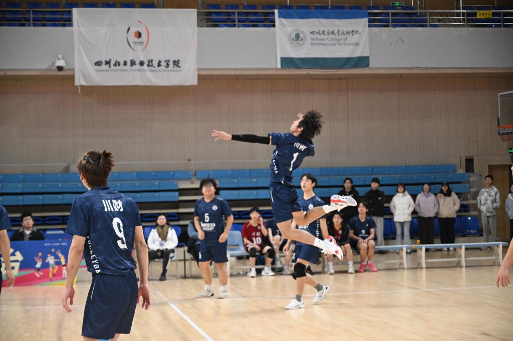 我校排球队奋勇出征,在赛场上展现出顽强拼搏、团结协作的体育精神,赢得了现场观众与对手的尊重与喝彩。比赛中,队员们发球精准、扣杀有力,防守严密、配合默契,获得的每一分都凝聚着平日刻苦训练的汗水与智慧。无论是领先还是落后,他们始终沉着冷静,全力以赴,展现出良好的心理素质与团队凝聚力。通过团队协作,四川财经职业学院从小组赛中脱颖而出,取得了交叉淘汰赛资格。虽然在第二局以24:26惜败,这一比分让同学们感到遗憾与难过,却也激励了大家在以后的学习和生活中更加坚持不懈。