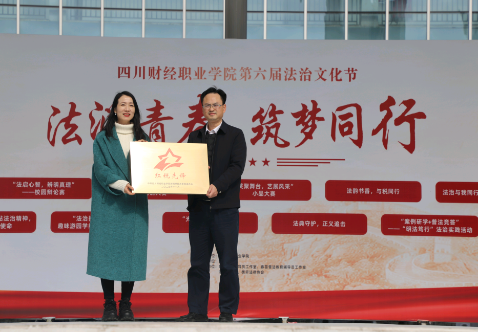 在随后举行的揭牌仪式上,四川财经职业学院纪委书记李洋与财税学院党总支书记陈露共同为"红税先锋"党建品牌揭牌。该品牌立足财税专业特色,旨在通过"党建+专业"的融合模式,将党建工作与学科建设有机结合,打造具有财经特色的育人平台。