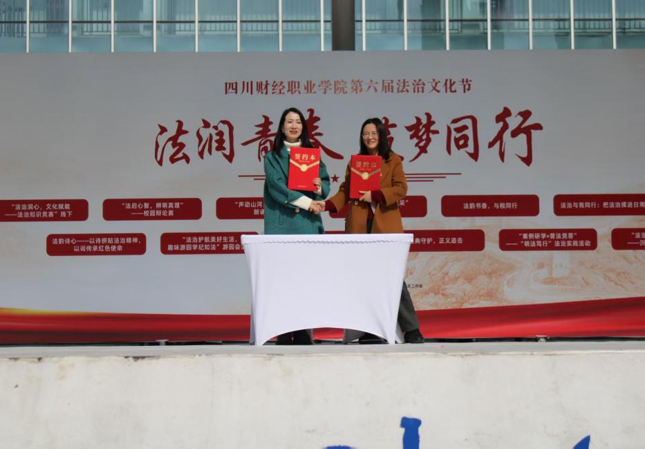 党建引航程,法治润校园。2025年11月18日,四川财经职业学院第六届法治文化节启动仪式在红石榴广场隆重举行。本次活动同步开展校企党建共建签约暨“红税先锋”党建品牌揭牌仪式,形成“法治教育+党建共建+品牌创建”三线融合的生动实践。学校纪委书记李洋、财税学院党总支书记陈露,中国移动通信集团四川有限公司龙泉驿分公司副总经理张庆慧等出席活动,学院近300名师生代表参加活动。