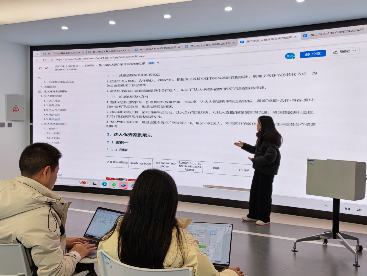 汇报以小组形式展开,共四个小组依次上台,围绕在订单班期间完成的达人媒介策划、内容运营、数据分析等实战项目进行成果展示。各小组通过详实的数据、清晰的逻辑和生动的案例,展现了在新媒体运营与媒介推广方面的学习成果与实践能力。
