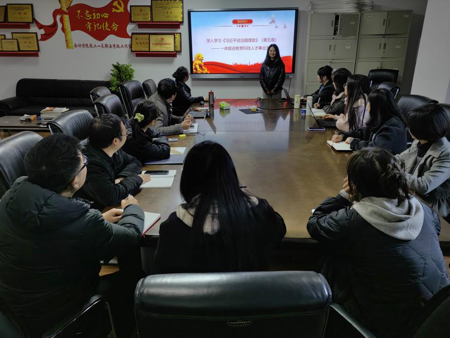 王晶晶同志领学《习近平谈治国理政》第五卷中“一体推进教育科技人才事业发展”专题相关内容。她结合学科发展与人才培养实际,系统阐述了教育、科技、人才“三位一体”协同推进的战略意义,并重点聚焦科技自立、人才激活、教育奠基、科技强国、教育强国五个方面展开具体解读。
