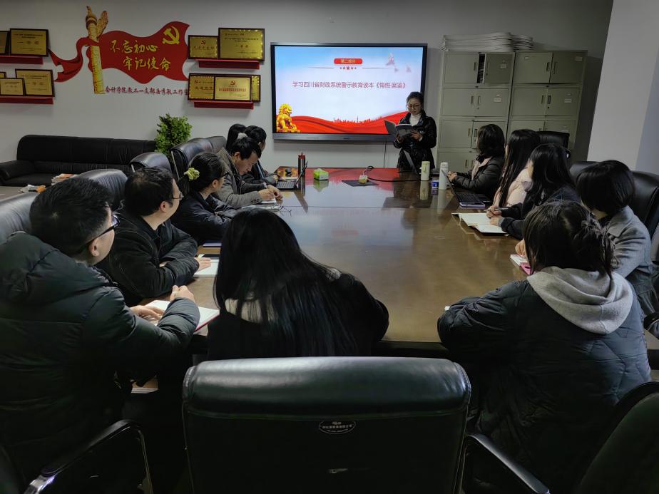 支部书记郭霞同志领学四川省财政系统警示教育读本《悔悟·案鉴》。她通过典型案例剖析,深刻警示全体党员要时刻保持清醒头脑,严守纪律底线,做到知敬畏、存戒惧、守底线。