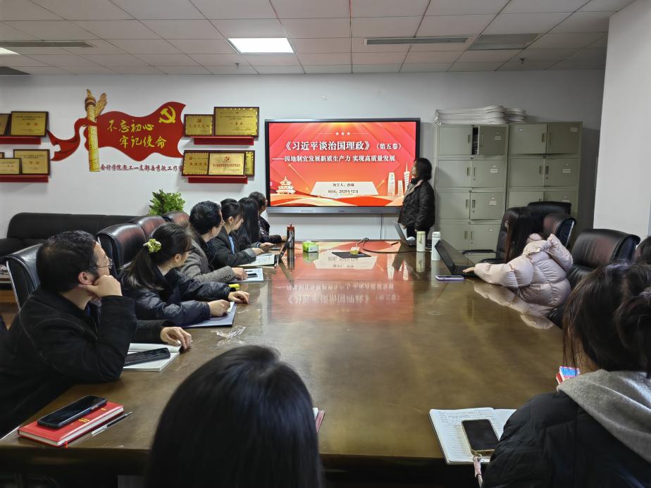 孙琳同志围绕《习近平谈治国理政》第五卷中“因地制宜发展新质生产力实现高质量发展”专题进行深入解读。她结合专业特点,探讨了如何将新质生产力理念融入教学科研,助力学院高质量发展。