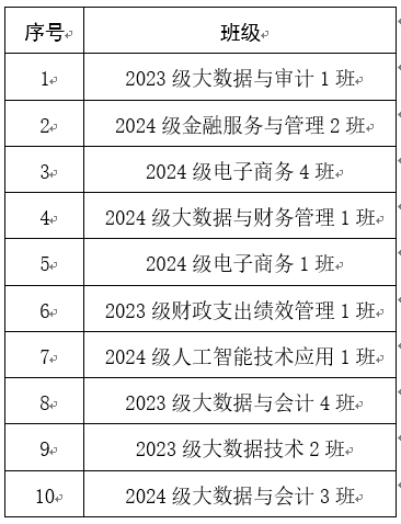 根据《四川财经职业学院学生奖励规定》的精神和要求,我校2024-2025学年“先进班集体”评选工作已经结束,经过各班级申报、二级学院初审、学生工作部复审和最终的汇报展示,本次共评选出“先进班集体”10个。现将结果进行公示。公示时间:2025年1月7日-1月9日。如对评选结果有异议,请在公示期间实名反馈。