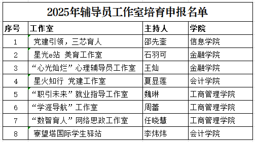 根据《四川财经职业学院辅导员工作室建设与管理办法》(川财职院行〔2021〕137号)》《关于开展第四批辅导员工作室培育项目申报暨前三批辅导员工作室评级认定工作的通知》(川财职院学工〔2025〕101号),经自主申报、资格审查、专家评议,现将2025年度校级辅导员工作室评级和申报培育的结果予以公示。