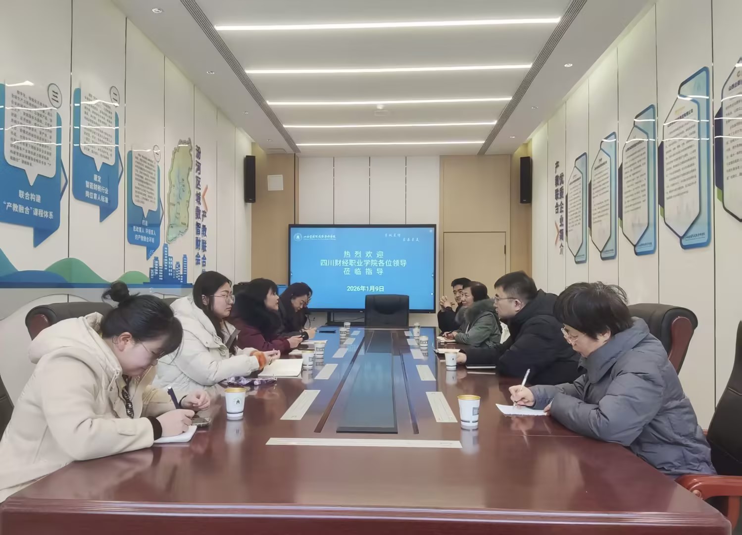 为深化高等职业教育教学改革,学习借鉴新一轮“国双高”建设兄弟院校的先进经验,2026年1月9日,四川财经职业学院财税学院副院长罗艾、财税大数据应用教研室主任蒋莉蘋、教学科长唐旖旎一行赴山西省财政税务专科学校开展交流。山西省财政税务专科学校财税学院党总支书记张希、财税学院院长张明珠、会计学院副院长李飞及各教研室主任共同参加了此次交流。