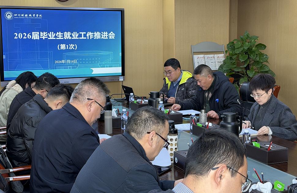 为全面贯彻落实教育部关于2026届高校毕业生就业创业工作系列部署,扎实推进学院就业工作提质增效,1月14 日下午,四川财经职业学院在明德楼912会议室召开了2026届毕业生第一次就业工作推进会。会议由招生就业处处长刘波主持,分管学院就业工作副院长李代俊出席会议并讲话,各二级学院党总支书记、院长及招生就业处相关工作人员参会。