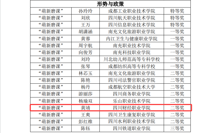 近日,四川省高职高专院校思想政治理论课“萌新磨课、骨干练兵”活动圆满落幕。马克思主义学院精心筹备、积极参赛,两位教师凭借新颖的教学设计、精准的学情分析以及优质的课件制作,在活动中收获亮眼成绩。经过专家严格评审,黄靖凭借清晰的教学思路、优质的课件荣获形势与政策组“萌新磨课”二等奖,曾露依托严谨规范的教学设计、精准透彻的学情分析斩获形势与政策组“骨干练兵”二等奖。