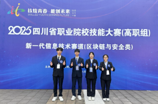 2016年01月16日-19日,2025年四川省职业院校技能大赛新一代信息技术赛道第三组比赛在成都工业职业技术学院(东校区)成功举办。我院信息安全技术应用专业参赛团队由曹文静、唐浩宇两位教师指导我院2024级信息安全技术应用专业1班曹鸿淋、杨欣滨杰、尹熙敏和晏萍4名同学,凭借扎实的专业功底、默契的团队协作与沉稳的临场应变,从全省41支高职院校代表队中脱颖而出荣获铜奖,为学院赢得荣誉。