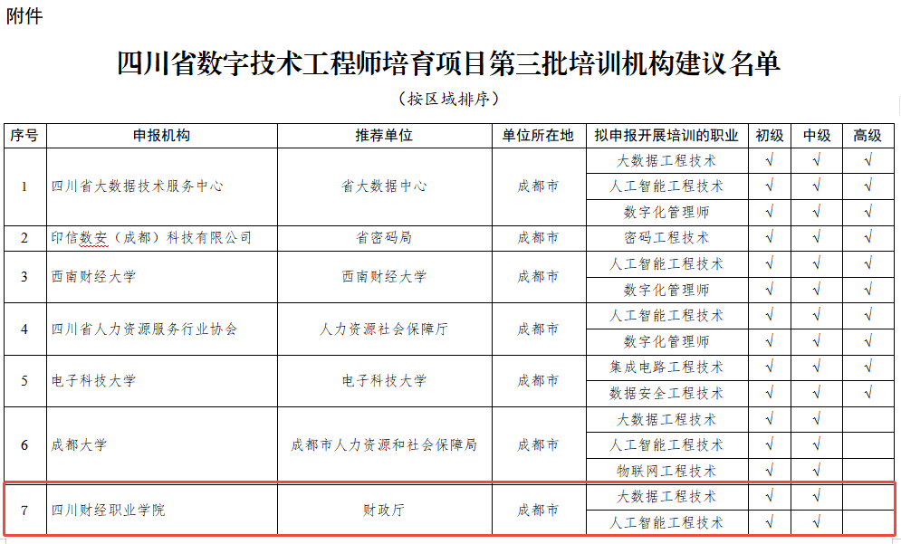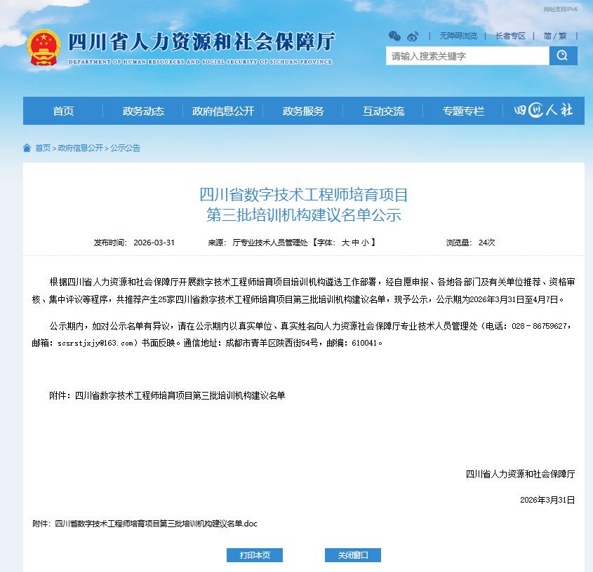 2026年3月31日四川省人力资源和社会保障厅发布《四川省数字技术工程师培育项目第三批培训机构建议名单公示》,经自愿申报、部门推荐、资格审核及集中评议等程序,四川财经职业学院成功入选该项目第三批培训机构名单。