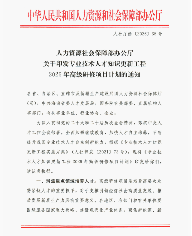 2026年3月31日,四川省人力资源和社会保障厅发布了《人力资源社会保障部办公厅关于印发专业技术人才知识更新工程2026年高级研修项目计划的通知》,四川财经职业学院申报的《数字财会人才培育赋能产业发展》项目成功入选该计划。