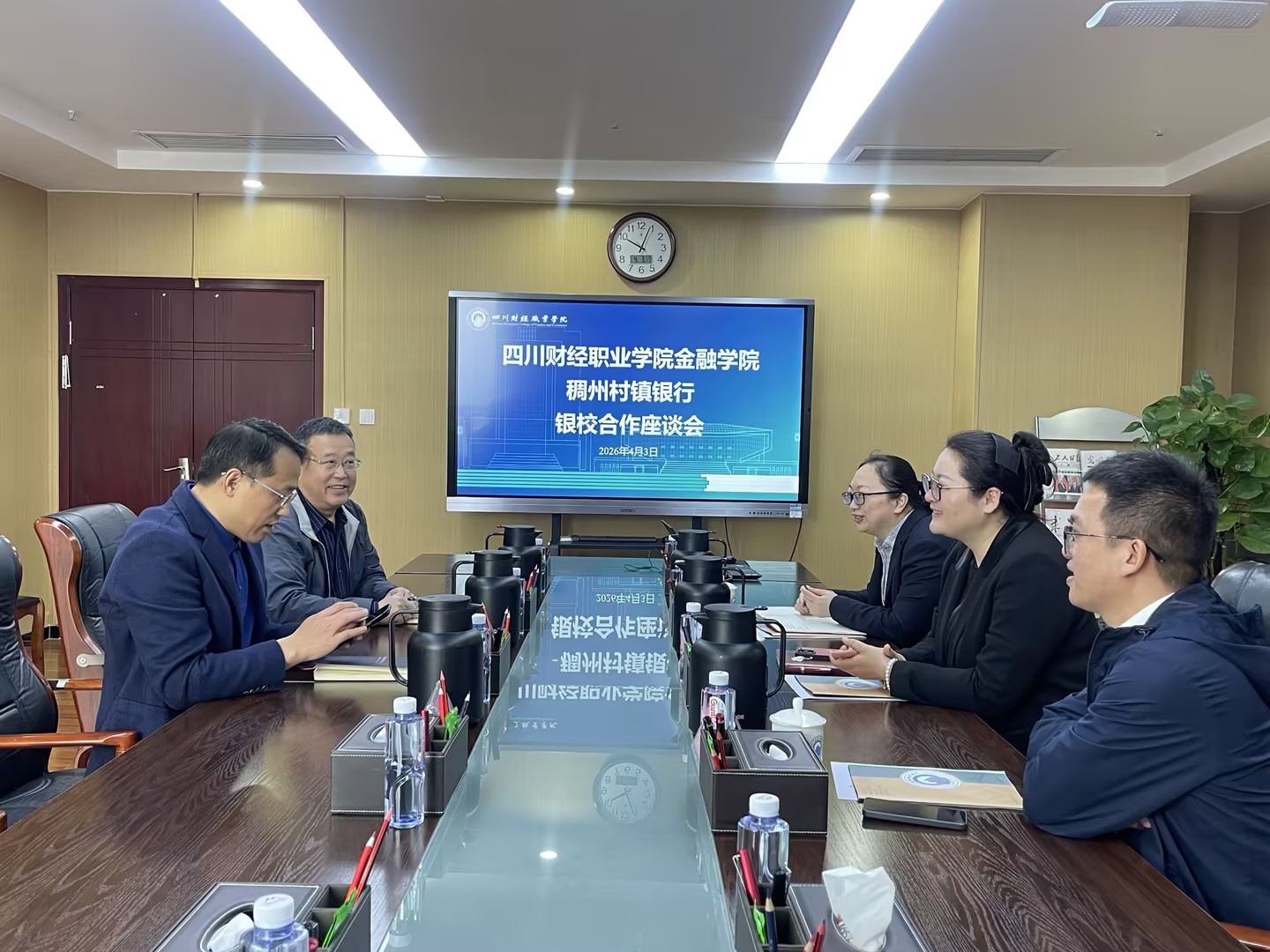 2026年4月3日,龙泉驿稠州村镇银行行长李晶一行到访四川财经职业学院,双方在学院明德楼913会议室召开银校合作座谈会。龙泉驿稠州村镇银行办公室主任钟伊、大面支行行长吴小兵随行到访;四川财经职业学院党委委员、副院长钟用,金融学院院长叶剑明及教学干事敬之月出席座谈。