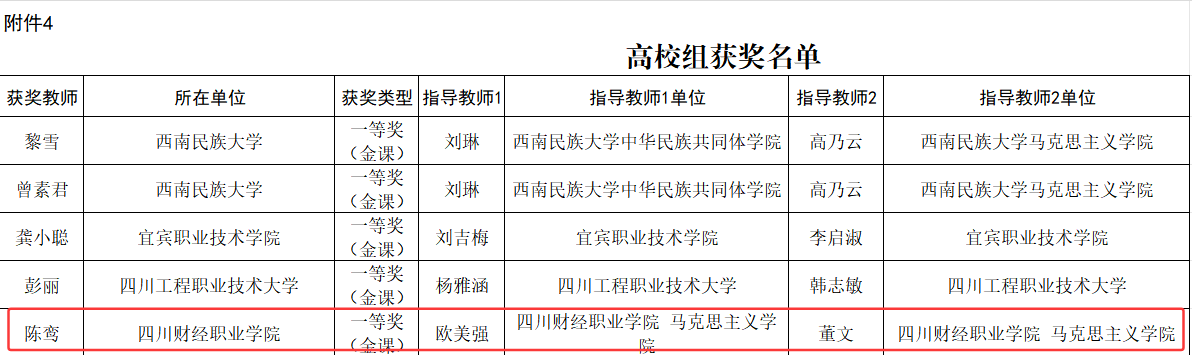 近日,四川省教育厅、中共四川省委宣传部、四川省民族宗教事务委员会联合发布《关于公布铸牢中华民族共同体意识“名师金课”评选活动获奖名单的通知》(川教函〔2025〕340号)。我校在此次评选活动中表现优异,荣获一等奖1项、二等奖1项。