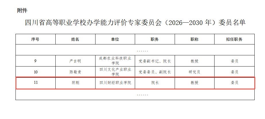 院长符刚教授入选“四川省高等职业学校办学能力评价专家委员会(2026—2030年)”委员。该委员会由省教育厅聘任管理,主要负责全省高职院校办学能力评价的研究、咨询与指导工作。符刚教授长期深耕教育管理与学科建设,主持多项省部级课题,荣获多项教学成果奖,其入选是对个人学术造诣与实践能力的高度认可。