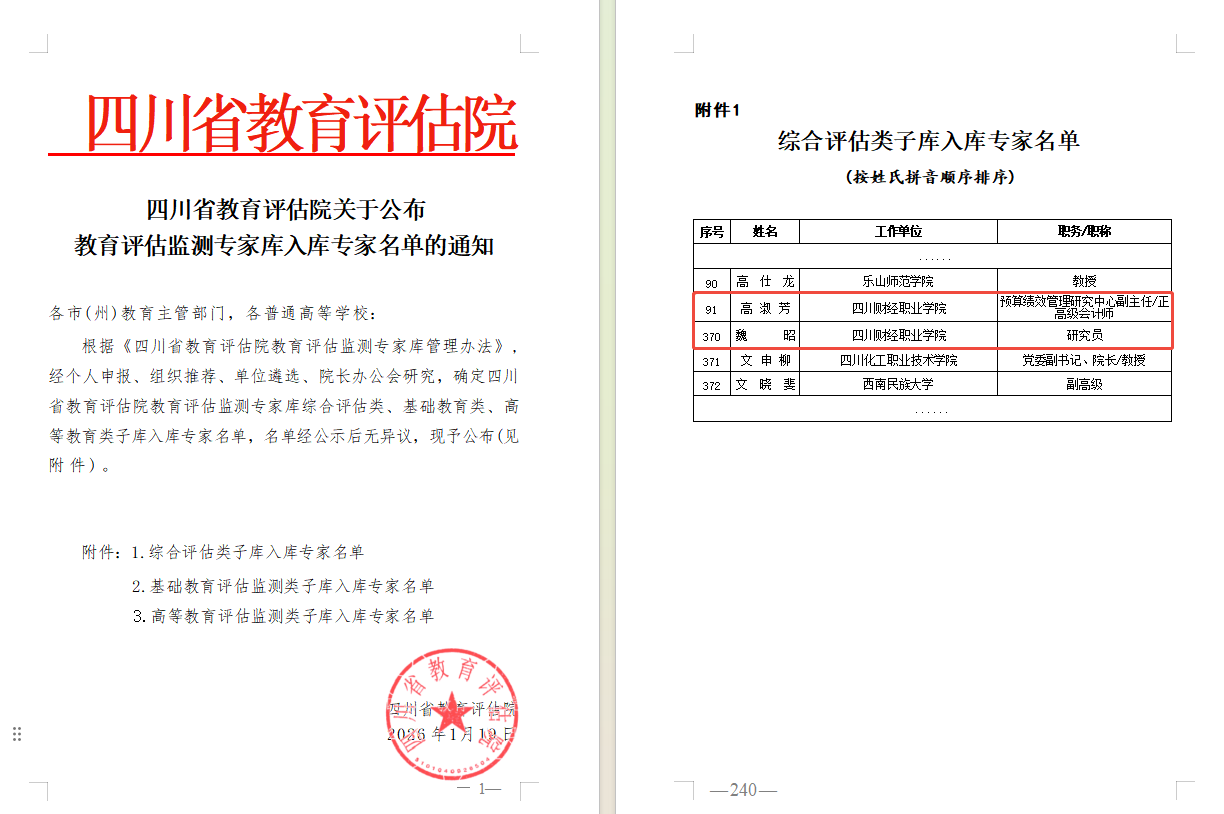 近日,四川省教育厅、四川省教育评估院相继发布通知,我校多位同志凭借扎实的专业能力与丰富的行业经验,成功入选省级教育评估相关组织,为学校赢得荣誉,彰显我校在财经类高职教育领域的综合实力与影响力。