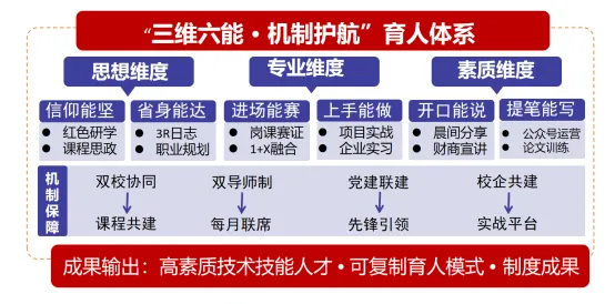 针对职教本科生可能存在的身份认同困惑及理论实践脱节问题,学院创新构建了“三维六能”立体化育人体系,从思想、专业、素质三大维度系统培育学生六大核心能力。