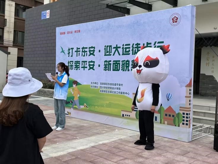 5月17日上午9点,会计学院行政干事郭海川老师,王亮老师带领志愿者们一同前往平安村参加由东安街道平安村主办,四川财经学院会计学院、龙泉驿区合驿社会工作服务中心协办开展的“打卡东安•迎大运徒步行,探索平安•新面貌新农村”大运会知识分享活动。