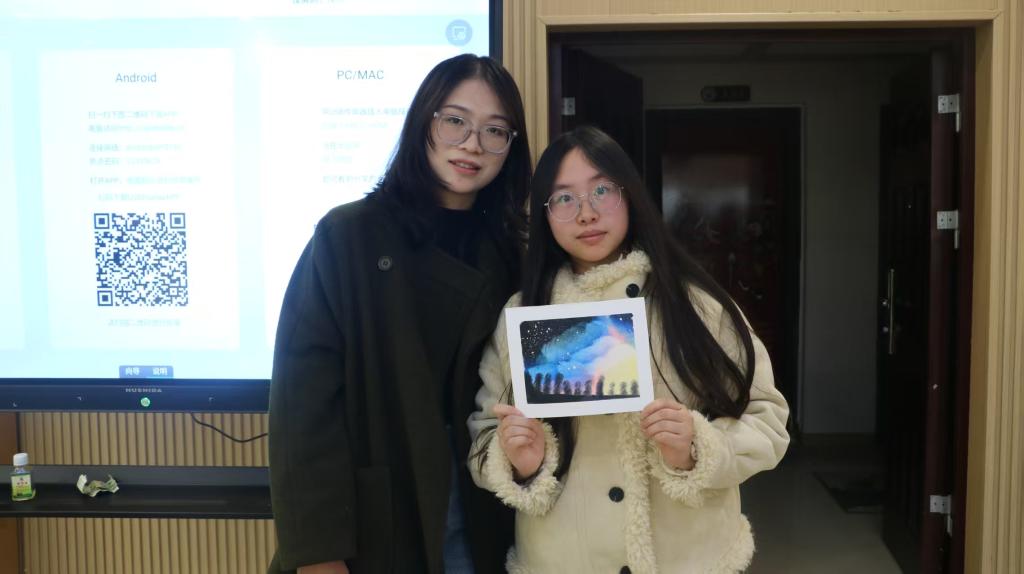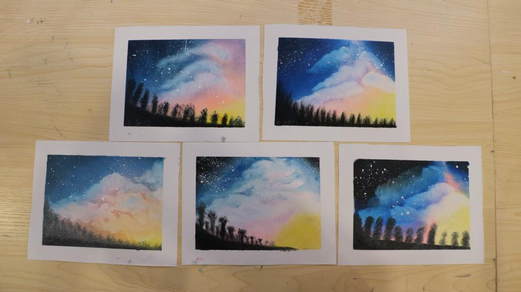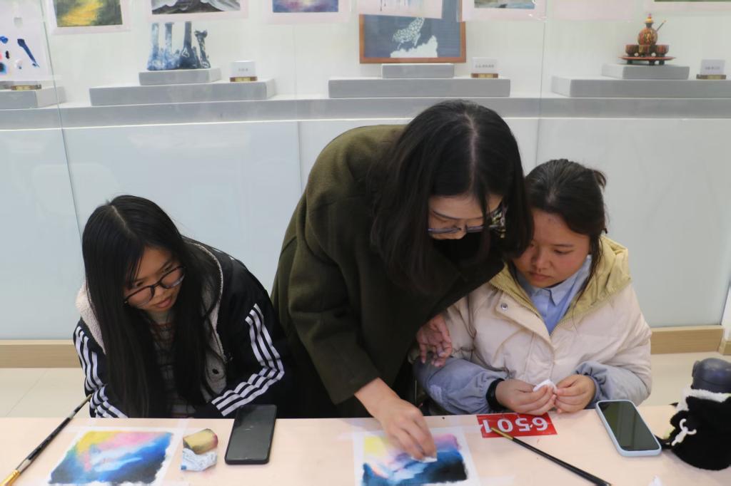 到了实践环节,画室里瞬间热闹起来。同学们握着画笔,蘸取深蓝、靛紫、银白等颜料尽情挥洒创意:有的同学细心勾勒出点缀夜空的闪烁繁星,银白刀痕利落明快,让星光格外灵动;更有同学大胆融入玫瑰粉、琥珀金等绚丽色彩,或点缀成星云边缘的霞光,或晕染成星空下的梦幻光晕,让传统技法与青春视角碰撞出别样火花。