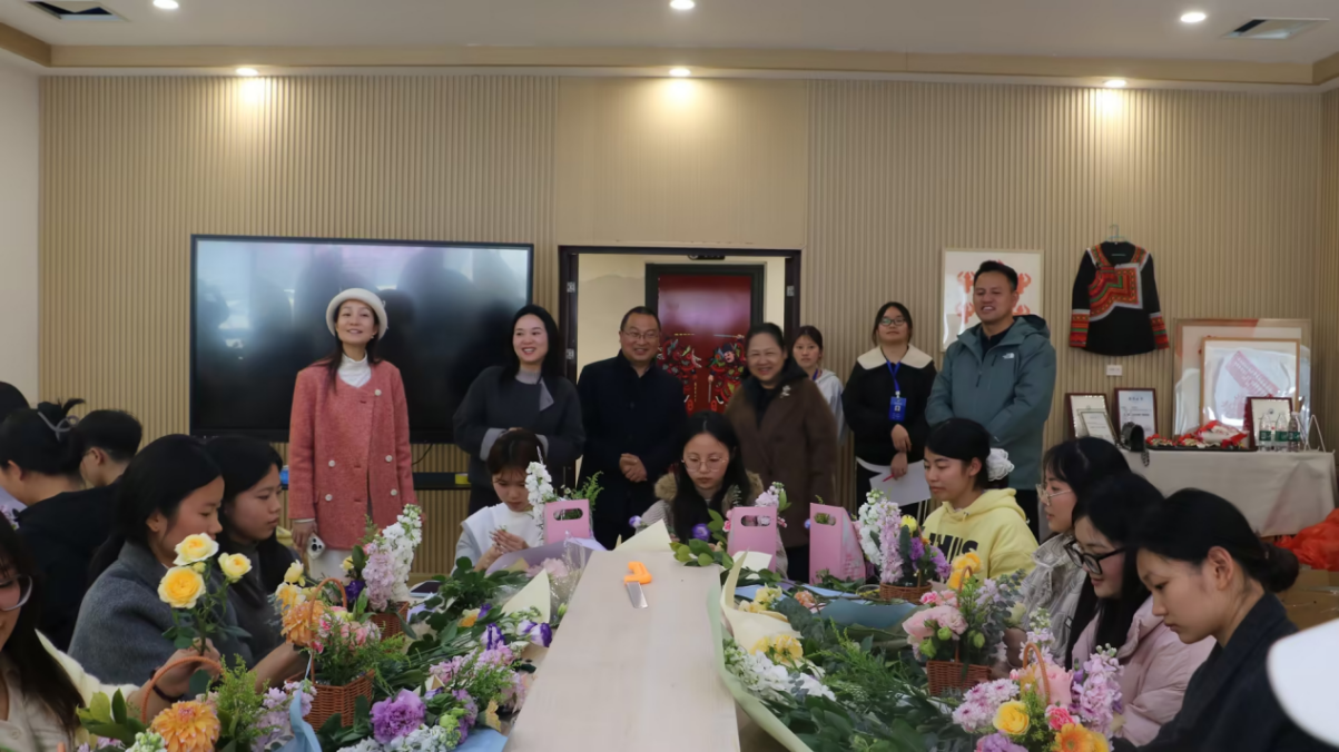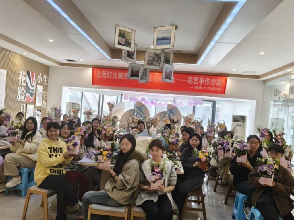 上元灯火映芳华,巧手插花赠春色。在元宵节与女生节来临之际,为深化美育浸润育人成效,丰富校园文化活动,校团委于3月3日下午在非遗教室133顺利举办花艺手作沙龙活动。全校50余名学生欢聚一堂,在馥郁花香与欢声笑语中邂逅花艺之美,共赴春日之约。学院党委书记张华,党委委员、副院长罗潇,学生工作部部长田刚成,团委书记高菁莅临活动现场,为同学们送上节日祝福。