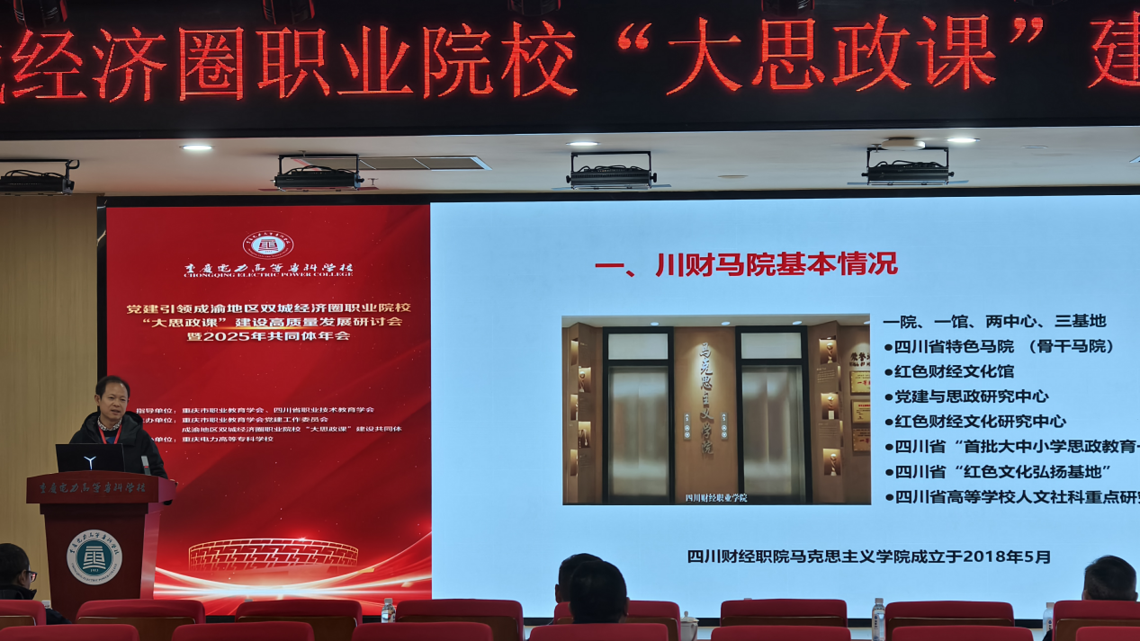 重庆电力高等专科学校、重庆文化艺术职业学院、重庆城市职业学院、四川财经职业学院、四川文化产业职业学院、四川信息职业技术学院等来自成渝地区职业院校代表,围绕党建与“大思政课”深度融合、课程创新、师资建设、实践育人等主题分享了典型经验。我院马克思主义学院李平参会并做“党建引领 红财铸魂 思政育人”典型经验交流发言,引起与会院校和嘉宾的强烈反响。