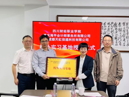 为深化产教融合、推动校企协同育人,四川财经职业学院与重庆海平会计师事务所、成都天虹通信科技有限公司校外实习基地授牌仪式于2025年4月10日顺利举行。学院党委委员、副院长李代俊带领会计学院副院长曾海帆、审计教研室主任郭霞及教师代表钟明君、辅导员雷惠婷,与重庆海平会计师事务所董事长杨友明、成都天虹科技有限公司董事长王珂及双方企业高管进行交流,并达成育人共识。