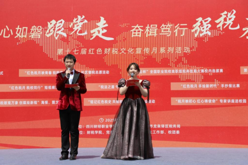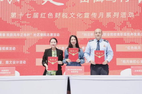 4月15日下午,由财税学院主办的第十七届红色财税文化宣传月启动仪式暨“税财协”党建共建签约仪式在红石榴广场隆重举行。龙泉驿区税务局党委委员、副局长孙学研,四川财经职业学院党委委员、副院长钟用,龙泉驿团区委副书记谭莉,学生工作部部长田刚成,宣传统战部副部长马宁,财税学院院长杨毅、党总支书记陈露等领导同数百名财院师生一起参加活动。