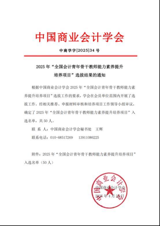 近日,会计学院教师郭霞成功入选中国商业会计学会“2025年全国会计青年骨干教师能力素养提升培养项目”。